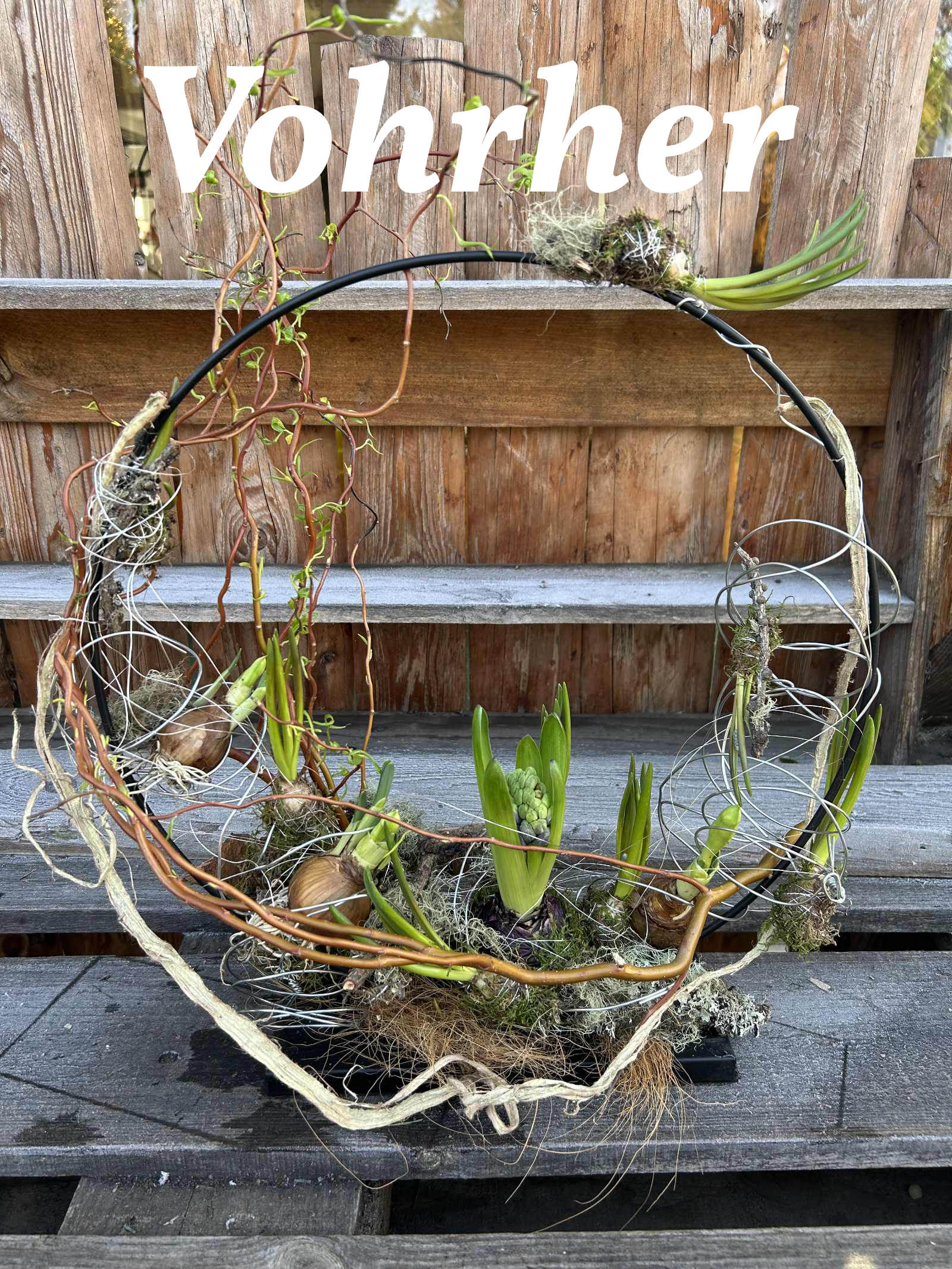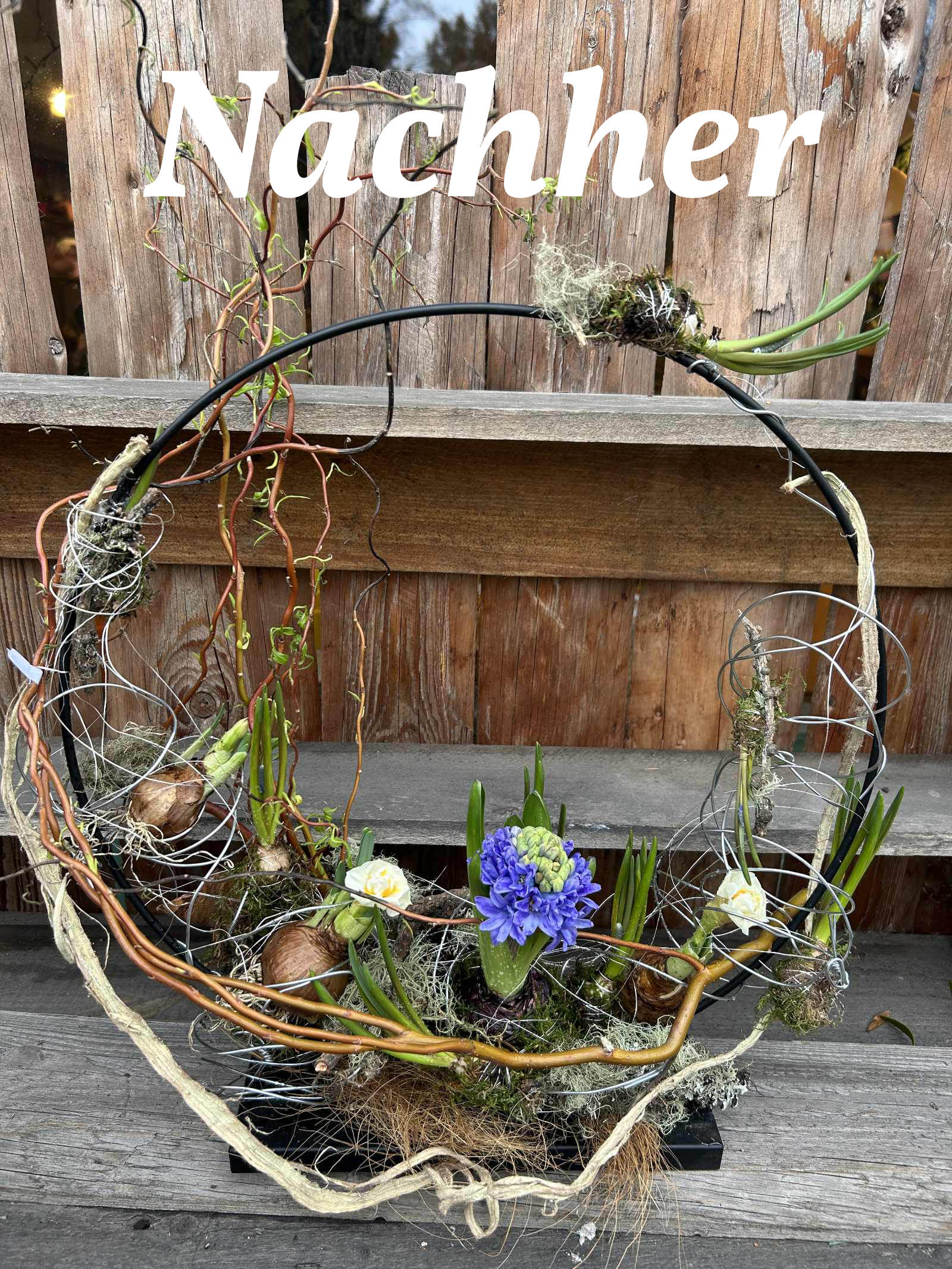 Wir dekorieren einen Loop auf Ständer mit Weide , bewickelten mit Moos Frühlingsblüher und dekorieren ihn mit Zweigen, Draht etc,
