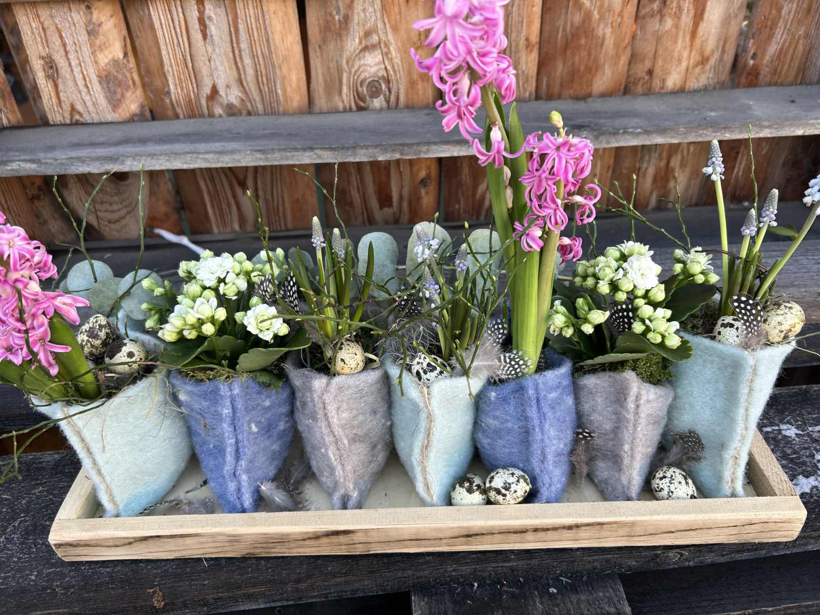 Tischdeko mit Filztaschen auf Tablett österlich dekoriert mit Federn, Wachteleier und Frühlingsblüher