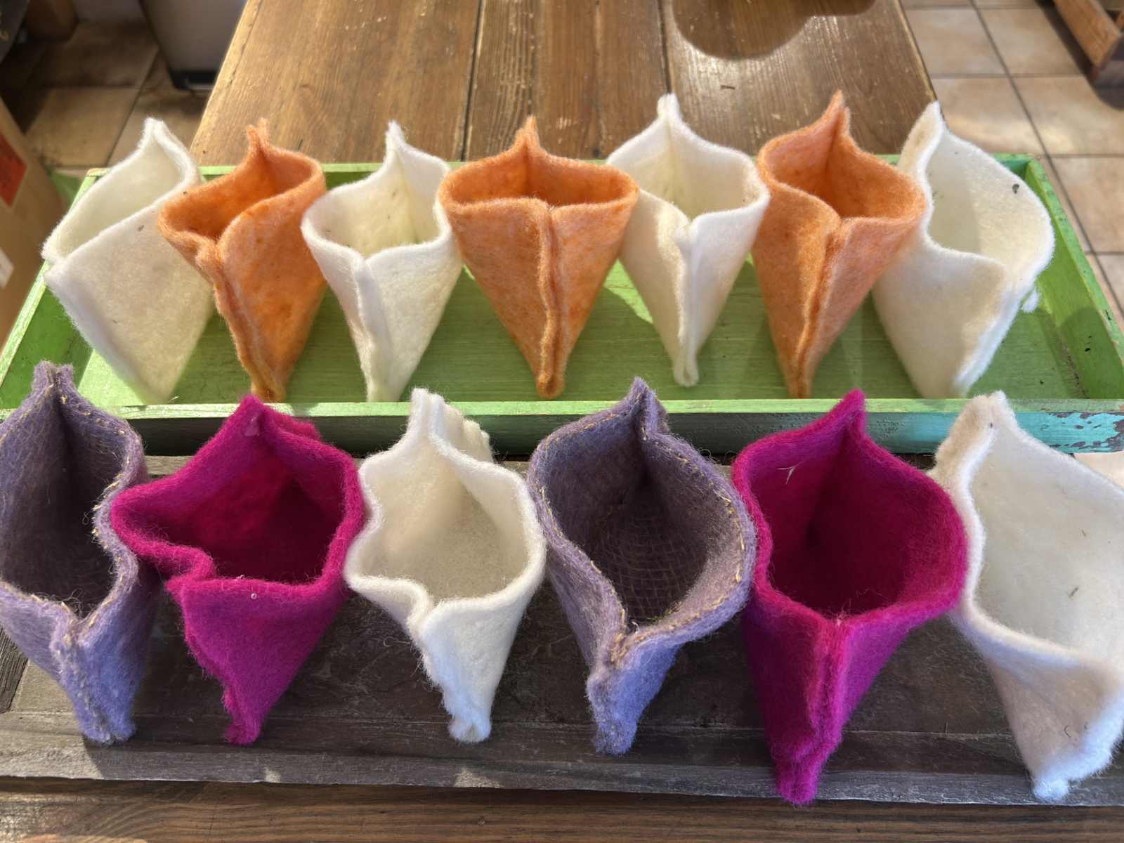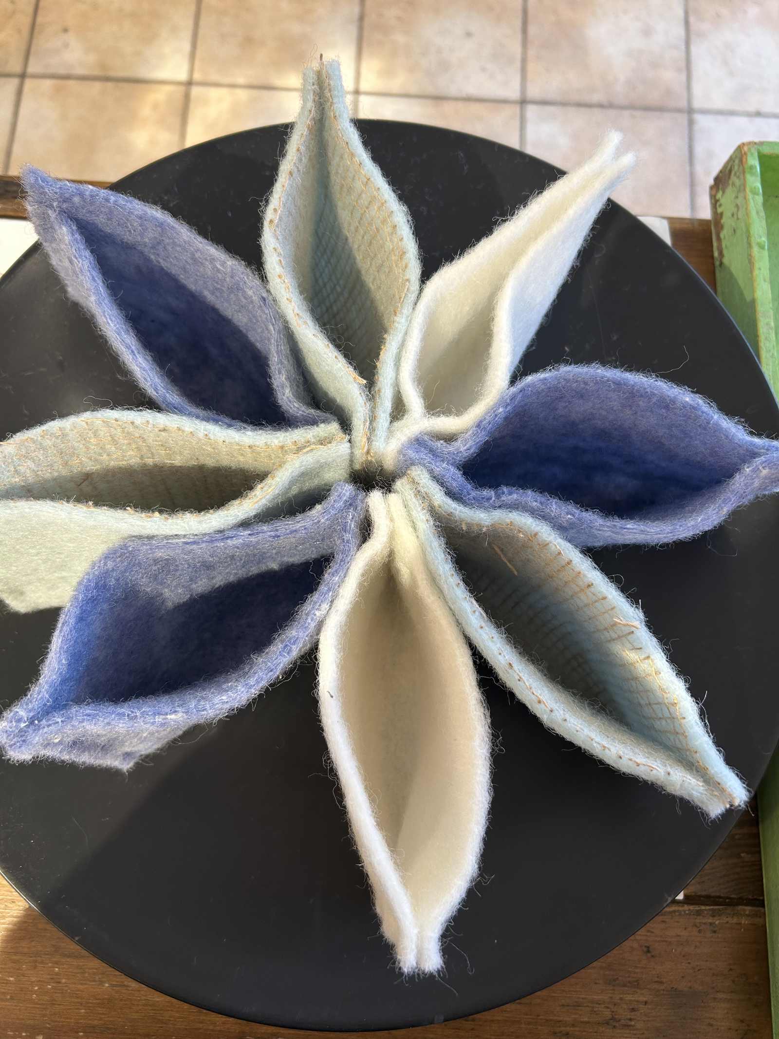 Ihr habt einen runden Tisch ? Dann können die Filztaschen rund auf einem Teller angeordnet werden.